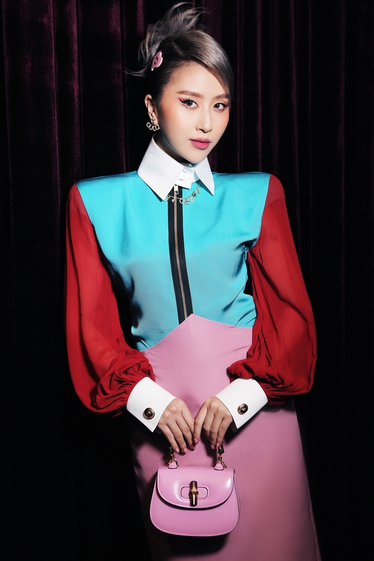 Quỳnh Anh Shyn "chơi đùa" với những gam màu nổi trong bộ váy phối túi xách bản vừa.
