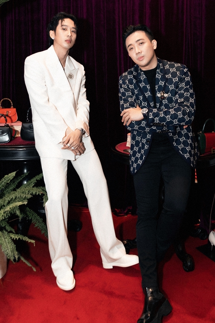 Diễn viên Tuấn Trần (trái) mặc đối lập với Trấn Thành. Anh chọn phong cách lãng tử với bộ suit trắng, phối giày ton-sur-ton.
