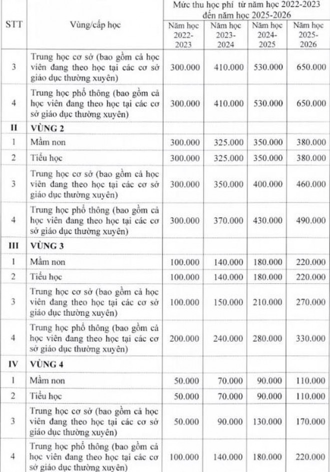 Theo dự thảo, học phí có thể sẽ tăng gấp đôi năm ngoái, trừ bậc THPT vùng 1 và 2 có mức học phí tăng từ 217.000 đồng (năm 2021) lên 300.000 đồng.