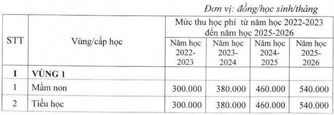 Mức học phí dự kiến áp dụng với các trường mầm non, phổ thông chưa đảm bảo chi thường xuyên (giai đoạn 2022-2026) cụ thể như sau (đơn vị: đồng/học sinh/tháng):