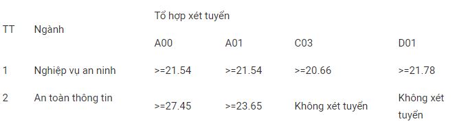 Theo đó, ngành Nghiệp vụ an ninh: 94 chỉ tiêu nam các tỉnh phía Bắc và một số tỉnh phía Nam (gồm các tỉnh sau: Quảng Trị, Thừa Thiên Huế, Đà Nẵng, Quảng Nam, Quảng Ngãi, Bình Định, Phú Yên, Khánh Hòa, Ninh Thuận, Bình Thuận, Kon Tum, Gia Lai, Đắc Lăk, Đắk Nông, Lâm Đồng).