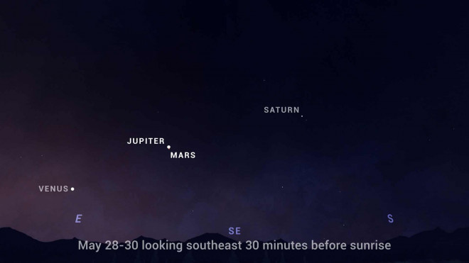 Thời điểm 2 hành tinh này ở gần nhau kéo dài từ ngày 27 hoặc 28 đến 30 hoặc 31-5 tùy theo múi giờ của từng quốc gia.
