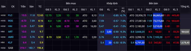 Trong đó, 2 mã chủ lực là FLC ngay lập tức rơi xuống mức giá sàn 11.800 đồng với lượng dư bán hơn 75 triệu cổ phiếu ở giá sàn. Cổ phiếu FLC Faros (ROS) rớt hết biên độ về giá 7.590 đồng với gần 60 triệu đơn vị chất sàn.