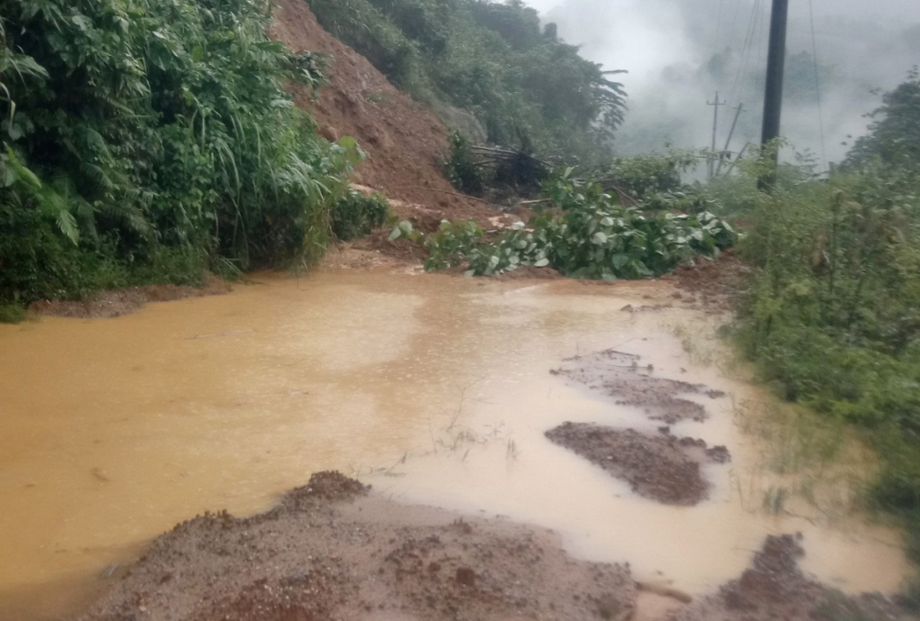 Đường vào xã Trà Leng bị lở đất, không thể lưu thông. Ảnh: Lê Hằng