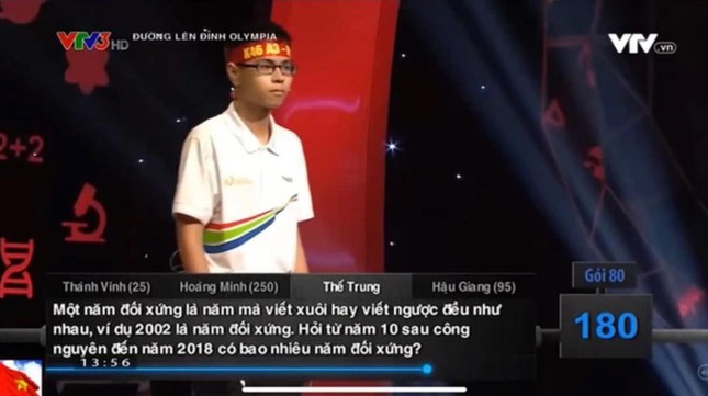 Một câu hỏi Olympia ở trận thi Quý I năm thứ 19 cũng thú hút sự chú ý của cộng đồng mạng. Câu hỏi có nội dung: "Một năm đối xứng là năm mà viết xuôi hay ngược đều như nhau, ví dụ 2002 là năm đối xứng. Hỏi từ năm 10 sau công nguyên đến năm 2018 có bao nhiêu năm đối xứng?".