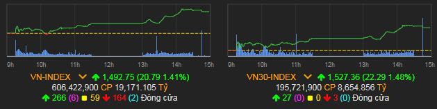 VN-Index tăng 20,79 điểm (1,41%) lên 1.492,75 điểm.