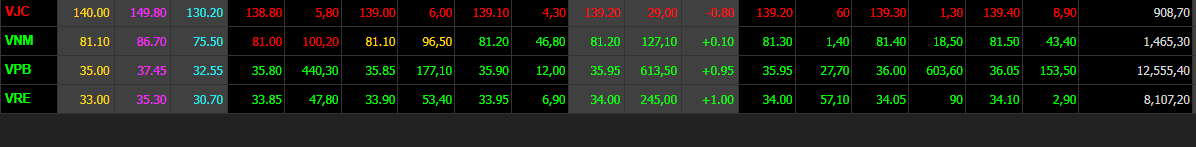 Nhóm Bluechips BVH, FPT, MSN, REE, MSN, VNM, VIC, VRE, VHM…cũng tăng điểm khá tích cực giúp sắc xanh thị trường được củng cố.
