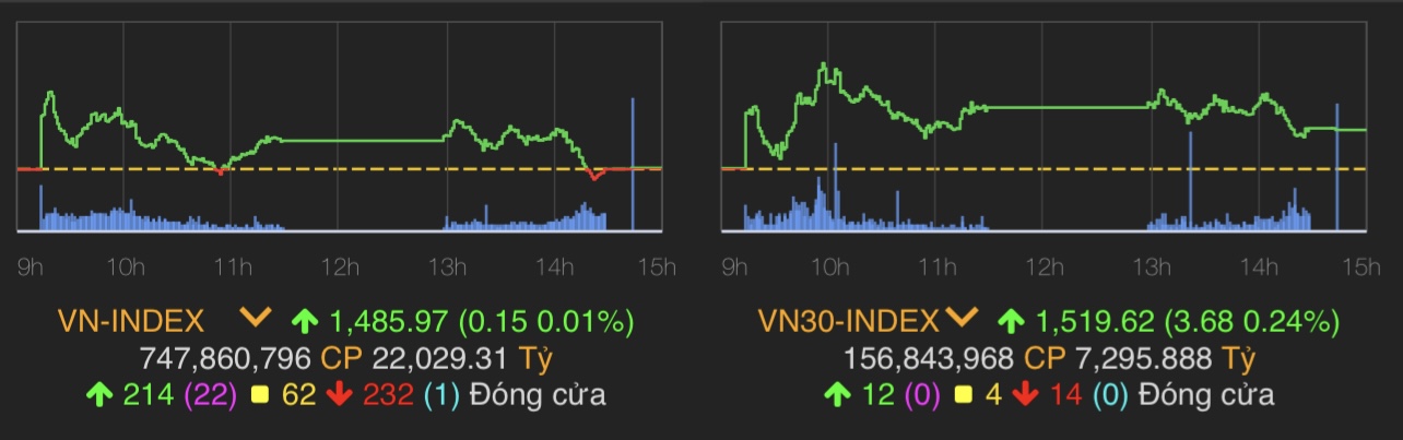 VN-Index tăng nhẹ 0,15 điểm (0,01%) lên 1.485,97 điểm.