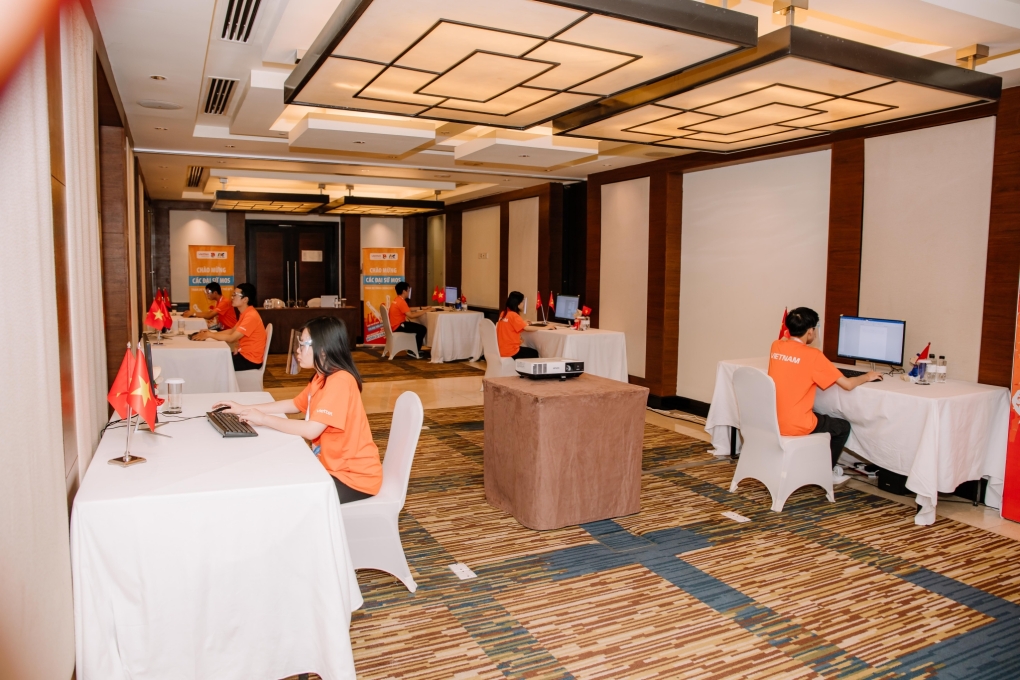 Huy (bên phải) cùng các thí sinh của đội tuyển Việt Nam làm bài thi Thi học văn phòng thế giới 2021. Ảnh: Nhân vật cung cấp