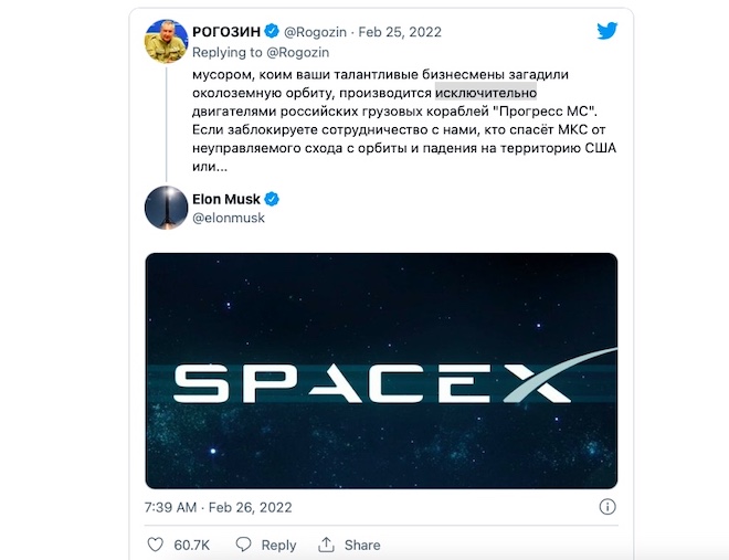 "Nếu bạn ngăn chặn việc hợp tác với chúng tôi, ai sẽ cứu ISS khỏi viễn cảnh không kiểm soát và rơi vào Hoa Kỳ hoặc châu Âu?", Rogozin đã đăng dòng tweet lên mạng xã hội Twitter như vậy. Sau đó, Elon Musk - CEO của SpaceX đã trả lời bằng cách đăng bức ảnh logo của công ty ông.