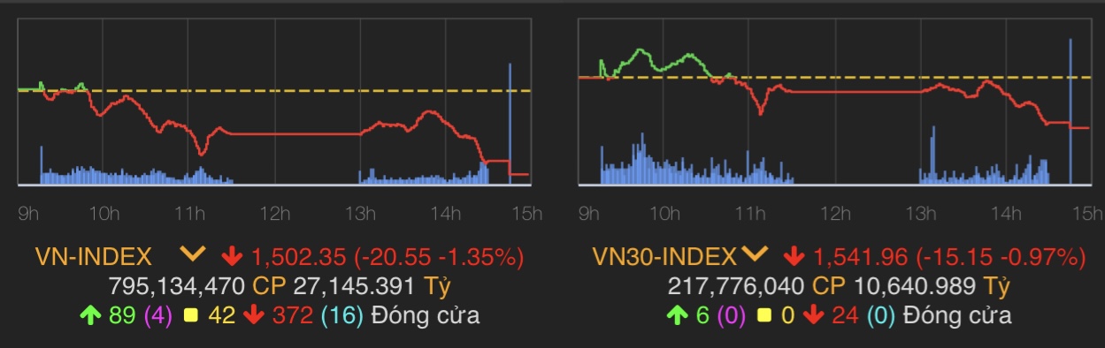 VN-Index giảm 20,55 điểm (1,35%) xuống 1.502,35 điểm.
