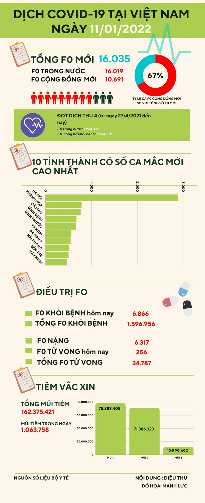 Bộ Y tế cho biết, trong 24h qua đã ghi nhận 16.035 ca nhiễm COVID-19 mới. Trong đó 16 ca nhập cảnh và 16.019 ca ghi nhận trong nước (tăng 1.236 ca so với ngày trước đó) tại 63 tỉnh, thành phố.
