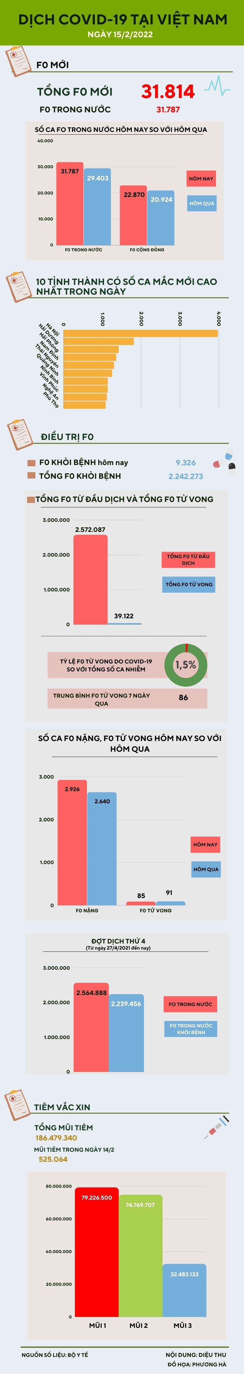 Ngày 15/2: Thêm 31.787 ca COVID-19 trong nước, riêng Hà Nội có 3.972 ca