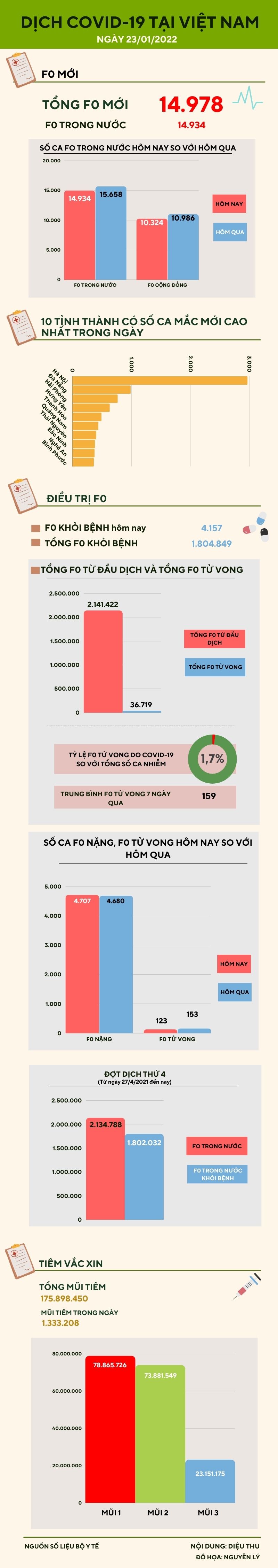 Ngày 23/1: Thêm 14.934 ca nhiễm COVID-19 trong nước