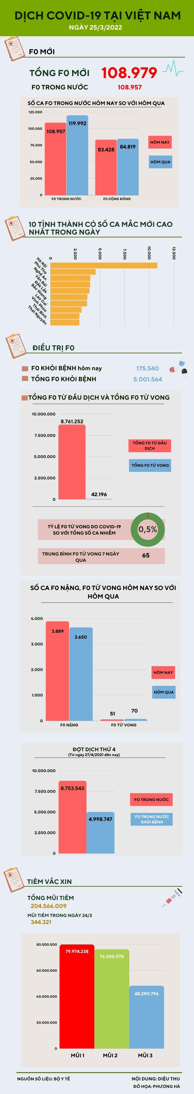 Tính từ 16h ngày 24/3 đến 16h ngày 25/3, trên Hệ thống Quốc gia quản lý ca bệnh COVID-19 ghi nhận 108.979 ca nhiễm mới, trong đó 22 ca nhập cảnh và 108.957 ca ghi nhận trong nước (giảm 11.035 ca so với ngày trước đó) tại 62 tỉnh, thành phố (có 83.428 ca trong cộng đồng).