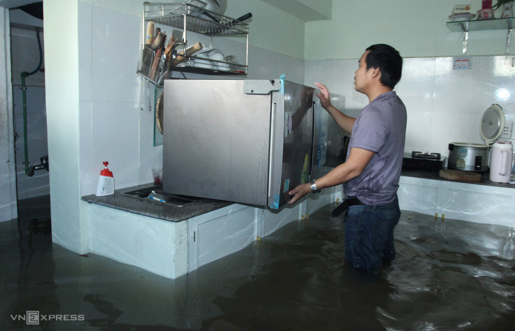 Anh Nguyễn Hữu Danh, ở khối phố Mỹ Thạch Bắc, cho tủ lạnh lên cao khi nhà bị ngập hơn nửa mét đầu tháng 12/2018. Ảnh: Đắc Thành