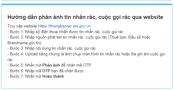 Cùng với đó, công cũng hướng dẫn người dân đăng ký/hủy đăng ký vào danh sách không quảng cáo; cập nhật, công bố danh sách IP/dải IP phát tán tin nhắn rác hoặc lạm dụng phát tán tin nhắn rác.