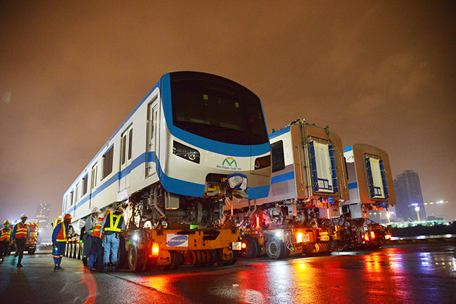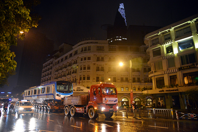 Đúng 0h ngày 10/10, 3 xe siêu trường, siêu trọng chở 3 toa tàu metro số 1 từ khu vực cảng Khánh Hội (quận 4) về khu depot Long Bình (quận 9, TP.HCM).