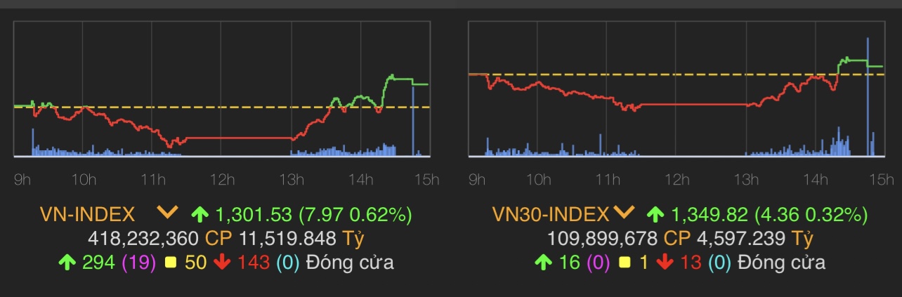 VN-Index tăng 7,97 điểm (0,62%) lên 1.301,53 điểm.
