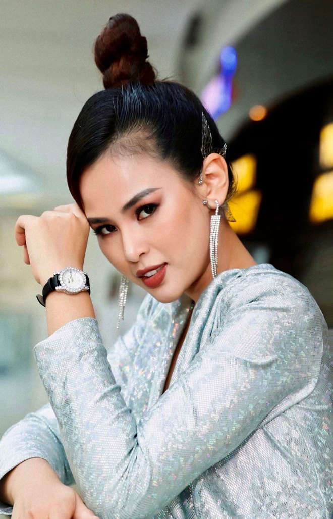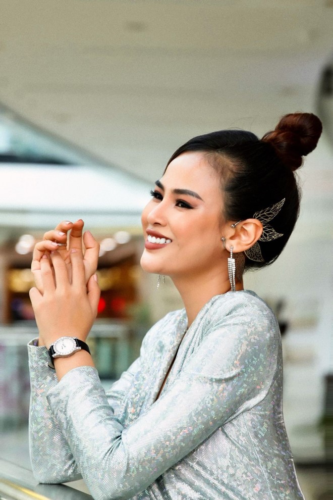 Hoa hậu Rita Đặng xuất hiện nổi bật trong bộ đầm bạc và phụ kiện lấp lánh tại buổi họp báo MV mới của Đức Phúc.