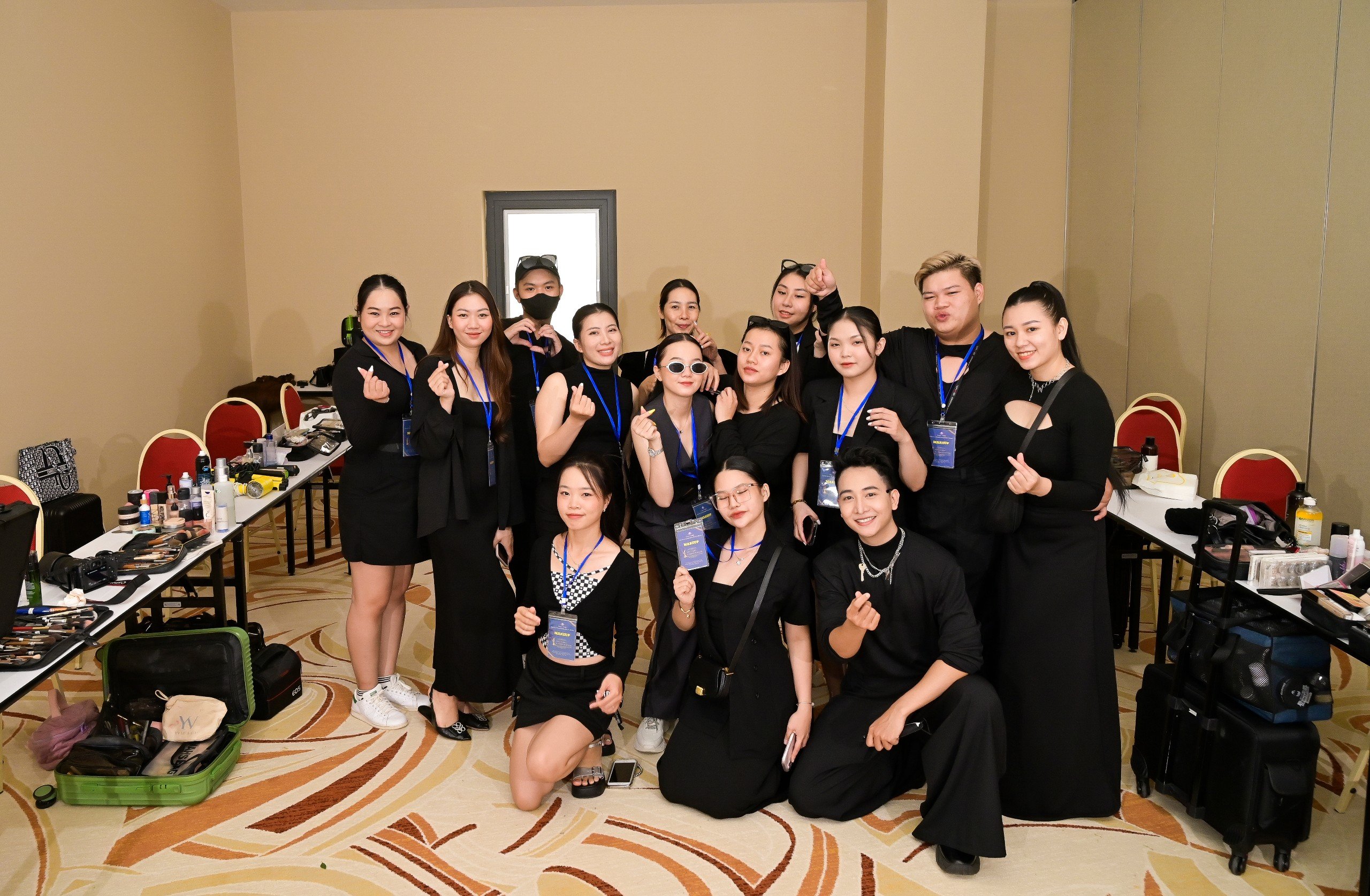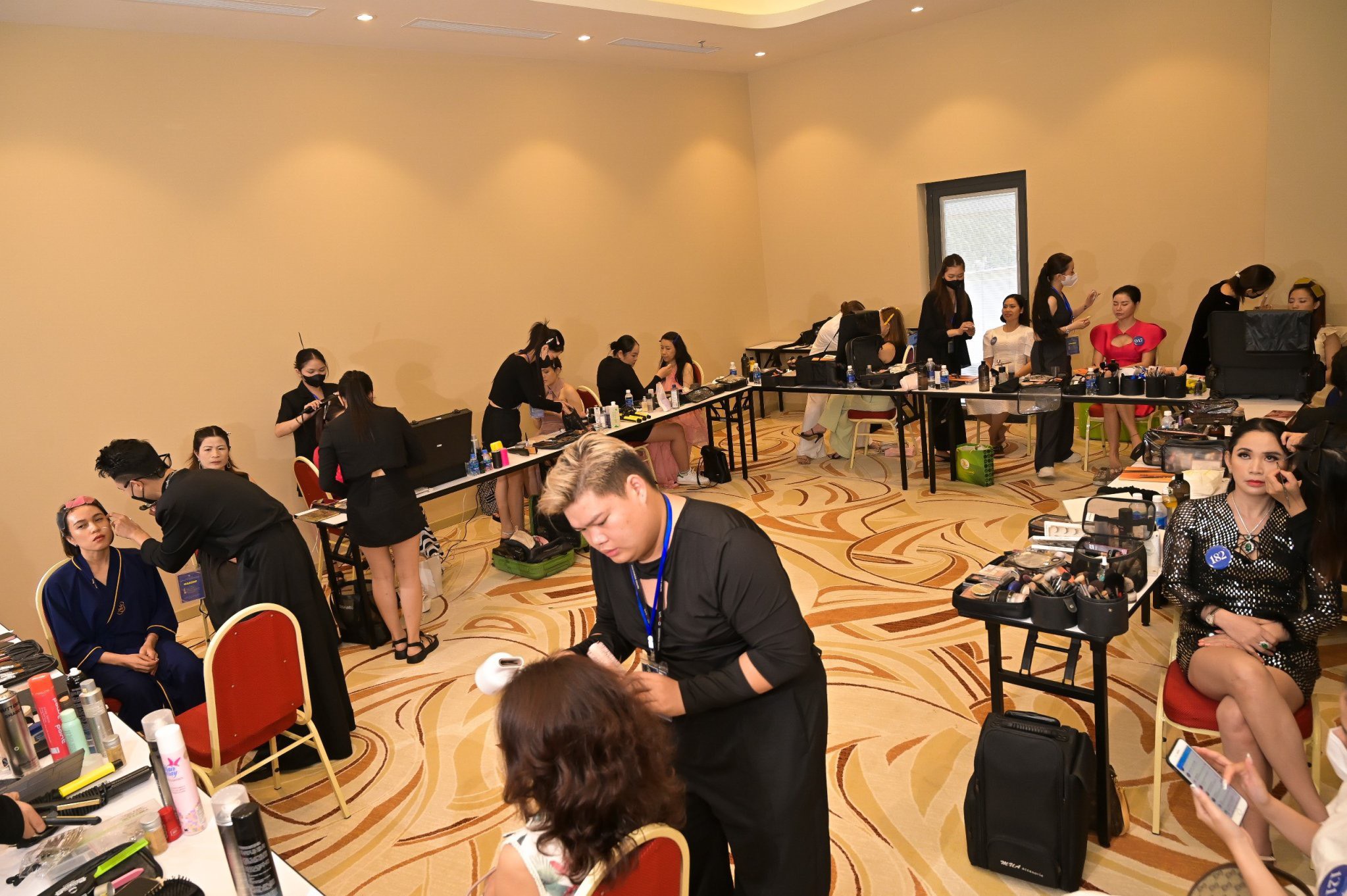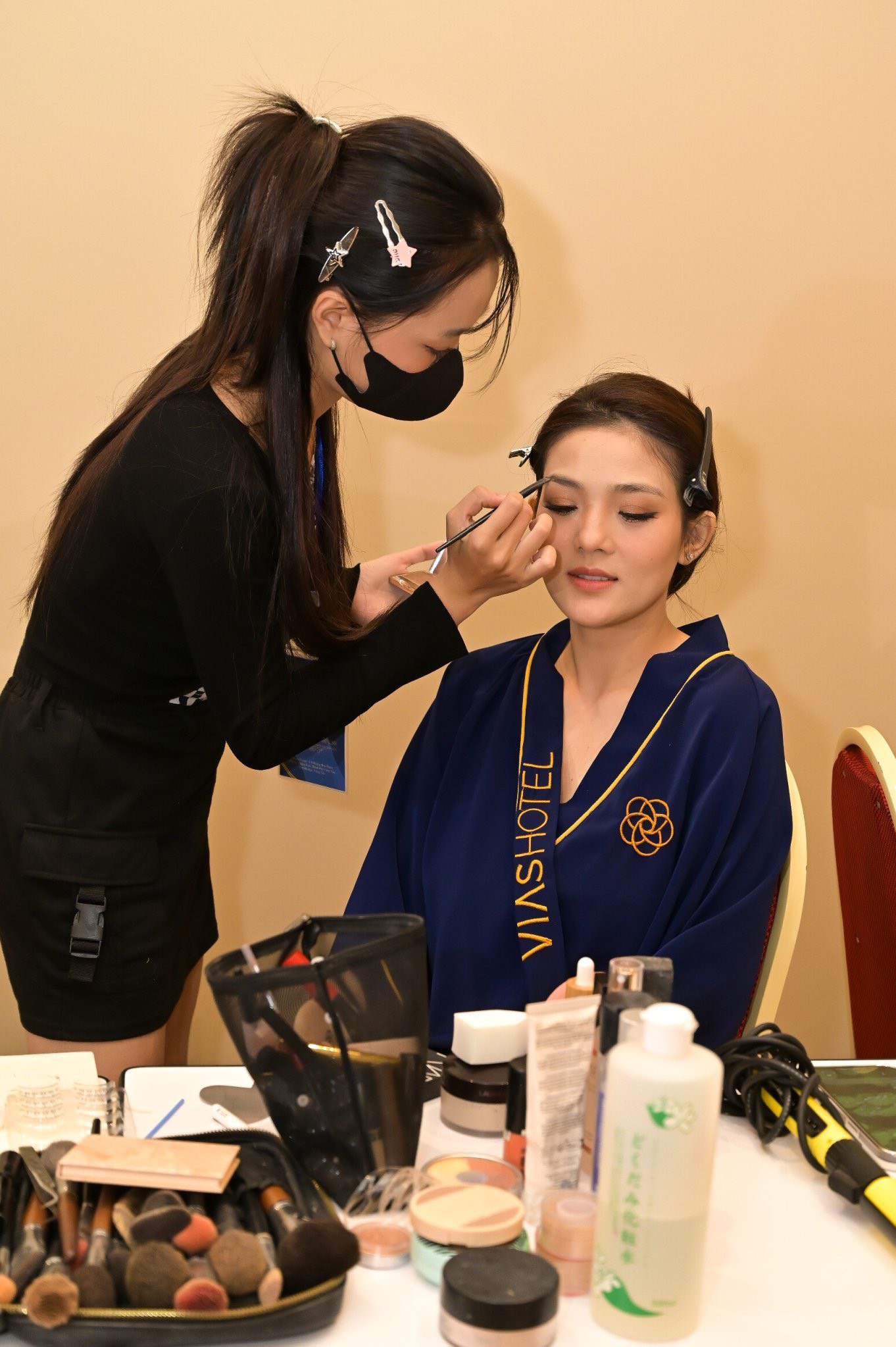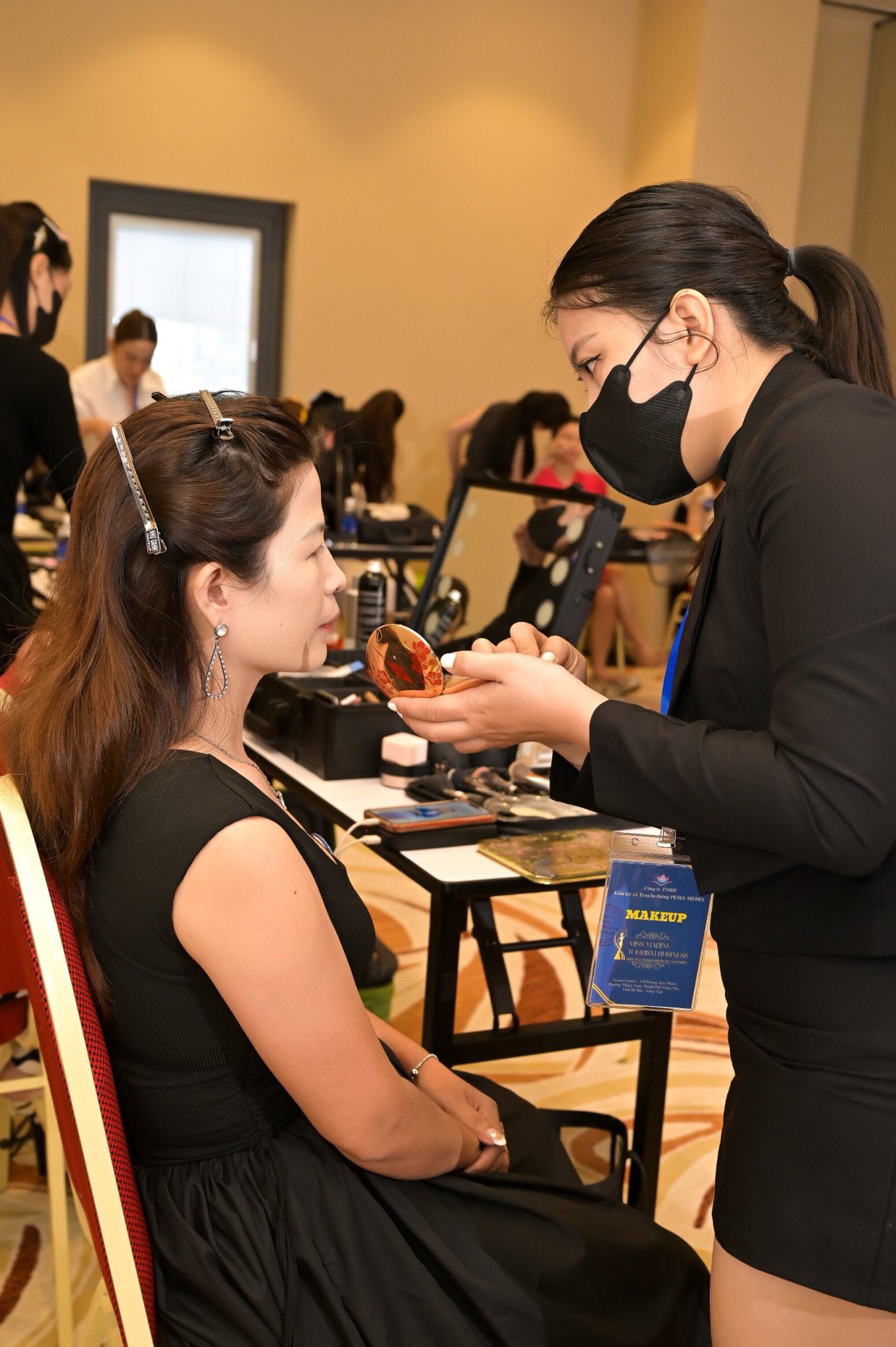 Các thí sinh và ê-kíp bận rộn trong hậu trường trang điểm cho đêm bán kết Hoa hậu Doanh nhân Du lịch Biển.
