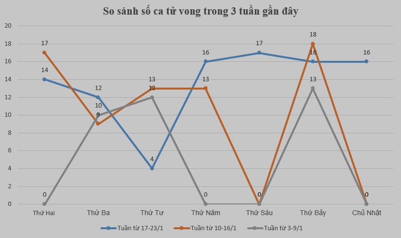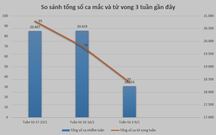 Tuy nhiên, số ca tử vong theo công bố của Bộ Y tế tại Hà Nội trong tuần lại tăng lên, tổng số 95 ca. Số ca tử vong tăng lần lượt 25 ca so với tuần 10-16/1 (70 ca) và 60 ca so với tuần 3-9/1 (35 ca).