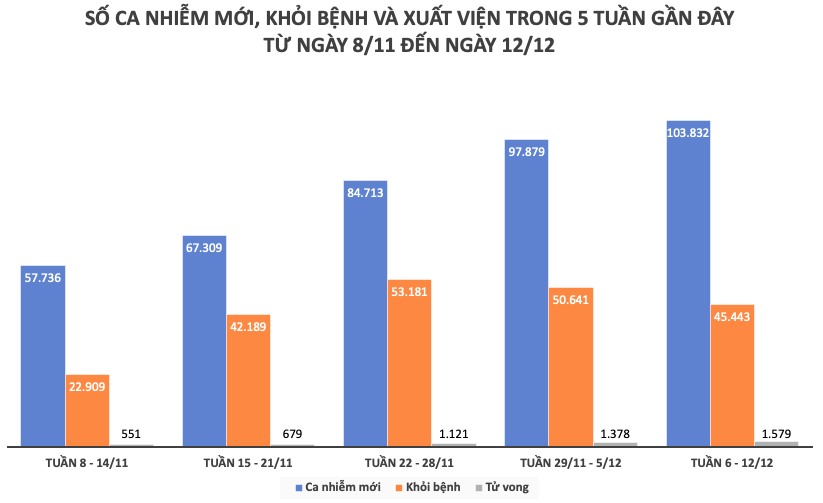 Còn xét trên phạm vi cả nước, ngày ghi nhận số ca nhiễm COVID-19 cao nhất trong tuần qua là ngày 11/12 với 16.104 F0, ngày có nhiều bệnh nhân COVID-19 xuất viện nhất là ngày 8/12 với 24.737 trường hợp. Trung bình tuần qua, mỗi ngày có hơn 225 trường hợp tử vong vì COVID-19, chiếm hơn 1,5% so với số ca nhiễm mới.