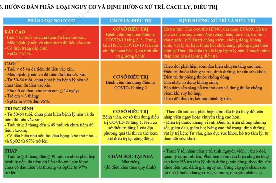 Theo hướng dẫn này, việc phân loại theo 4 nhóm nguy cơ (theo bảng màu đỏ - cam - vàng và xanh) và định hướng xử trí, cách ly, điều trị, cụ thể: