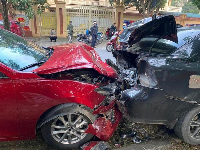 Đang lưu thông, chiếc xe ô tô hiệu Mazda3 màu đỏ bất ngờ đâm vào chiếc "xế hộp" phía trước gây ra vụ tai nạn liên hoàn.