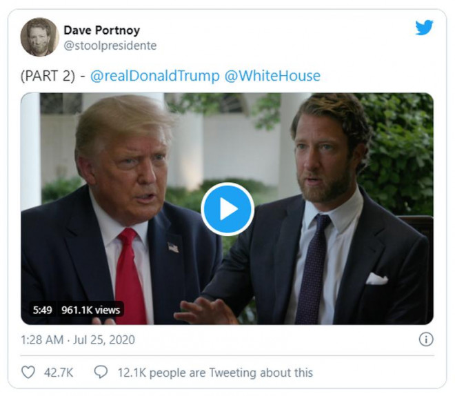 Tổng thống Mỹ Donald Trump có cuộc phỏng vấn với Dave Portnoy - chủ trang blog thể thao Barstool Sports hôm 24-7. Ảnh: TWITTER