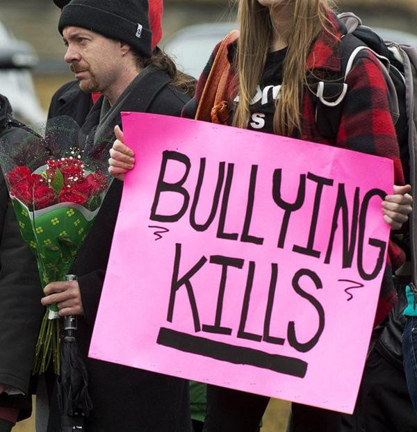 Một cô gái cầm tấm giấy ghi: "Việc bắt nạt có thể giết người". Ảnh: The Star.