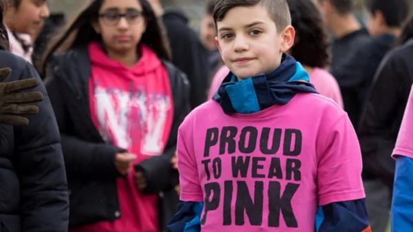 Một nam sinh Canada mặc áo màu hồng có ghi dòng chữ "Tự hào khi mặc màu hồng" để phản đối việc bắt nạt học đường, sau khi một học sinh bị bắt nạt chỉ vì mặc áo màu hồng. Ảnh: Peter So Photography.