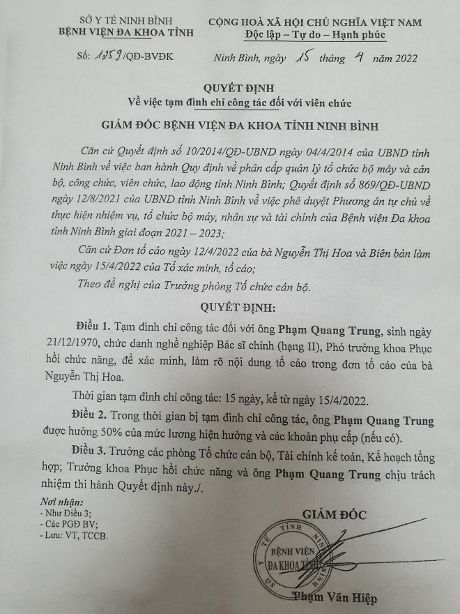 Ngày 22-4, tin từ Bệnh viện Đa khoa tỉnh Ninh Bình cho biết, ông Phạm Văn Hiệp, Giám đốc bệnh viện, đã ký quyết định tạm đình chỉ công tác 15 ngày đối với ông Phạm Quang Trung, Phó trưởng khoa Phục hồi chức năng, để làm rõ hành vi tố cáo của công dân.