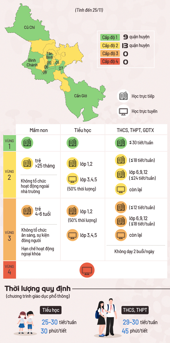 Kế hoạch mở cửa trường theo cấp độ dịch của Sở Giáo dục và Đào tạo TP HCM. Đồ họa: Tạ Lư