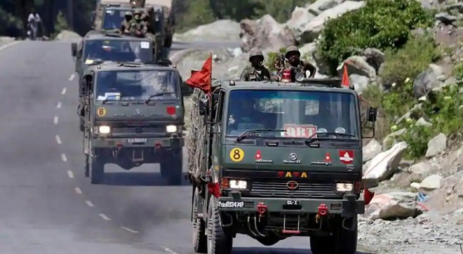 Đoàn xe quân sự tiến về vùng tranh chấp với Trung Quốc ở biên giới.