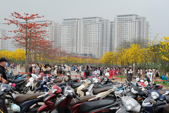 Mấy ngày nay rất đông người đến con đường hoa chụp ảnh. Xe máy, ô tô chật kín lối đỗ.