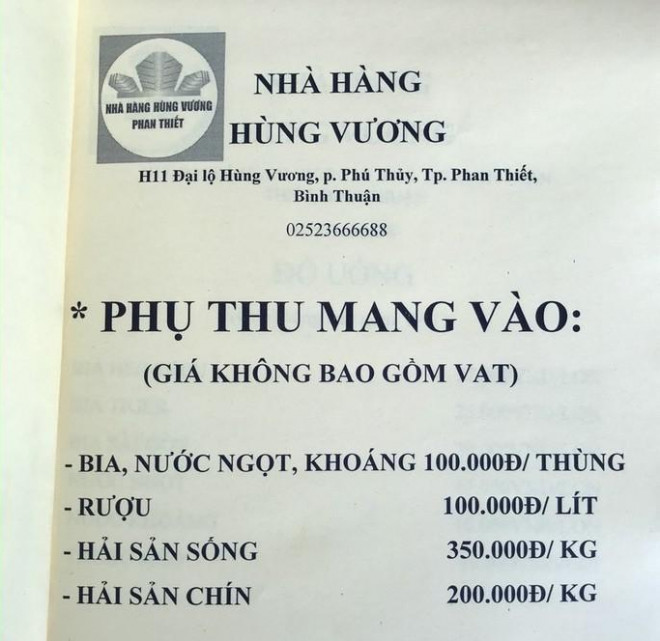 Làm việc với đoàn, đại diện nhà hàng Hùng Vương (nằm trên đường Hùng Vương, phường Phú Thủy, TP Phan Thiết) cho biết trước khi thu phụ phí 4,5 triệu đồng, phía nhà hàng đã có thông báo mức giá thỏa thuận với đoàn khách, và mức giá này thấp hơn bảng niêm yếu phụ thu của nhà hàng. Cụ thể, đối với hải sản sống khi thực khách mang từ bên ngoài vào nhà hàng sẽ tính phụ thu 350.000 đồng mỗi ký và được niêm yết công khai bảng giá.