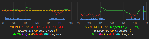 VN-Index giảm 0,52 điểm (0,04%) còn 1.475,5 điểm.