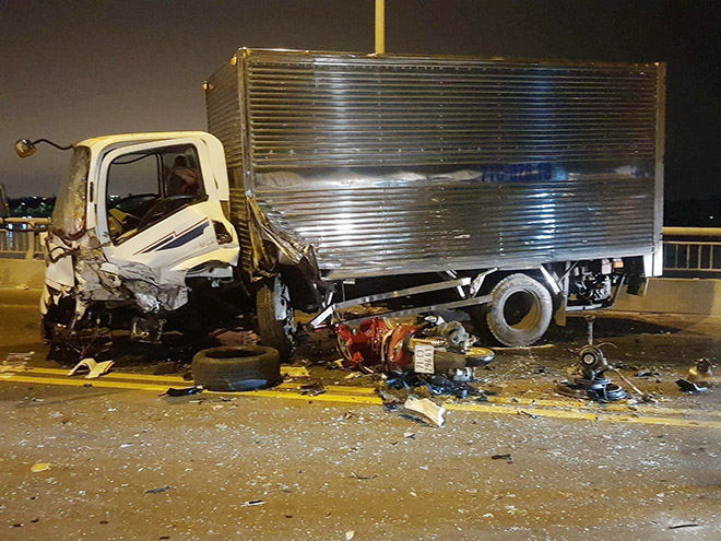 Tại hiện trường, ô tô bốn chỗ bẹp dúm, biến dạng phần đầu và xoay ngang đường. Xe tải cũng bị biến dạng, một bên hông cabin bị xé toạc, cạnh đó hai xe máy bị hư hỏng.