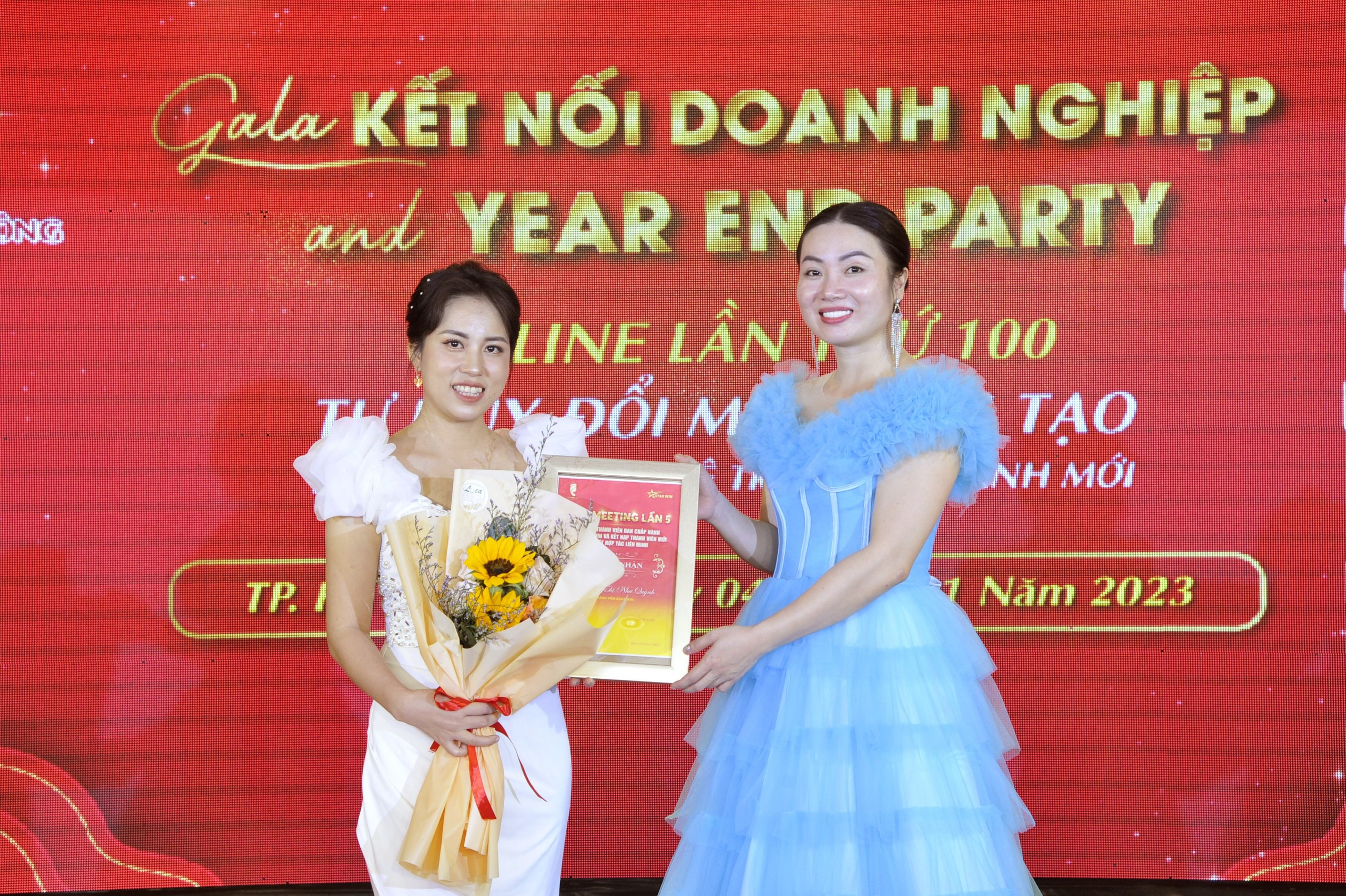 Hoa hậu doanh nhân Aphaca Asia Võ Thu Thuỷ đại diện trao hoa chúc mừng thành viên mới
