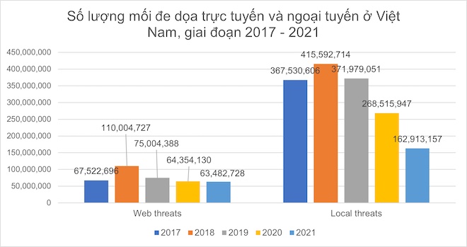 Như vậy, so với năm 2020, số lượng các mối đe dọa ngoại tuyến ở Việt Nam đã giảm 38,3%, từ 268.515.947 vụ. Theo báo cáo này, 56,7% người dùng Việt Nam bị tấn công bởi phần mềm độc hại lây lan, xếp thứ 31 trên toàn cầu và giảm 23 bậc so với năm trước.
