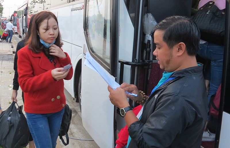 Công nhân về Tết trên các chuyến xe do công đoàn tổ chức, tháng 1/2021. Ảnh: Lê Tuyết