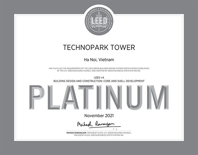 Bằng chứng nhận TechnoPark Tower đạt chứng chỉ LEED Platinum V4 – Phiên bản khó đạt nhất từ trước đến nay của LEED