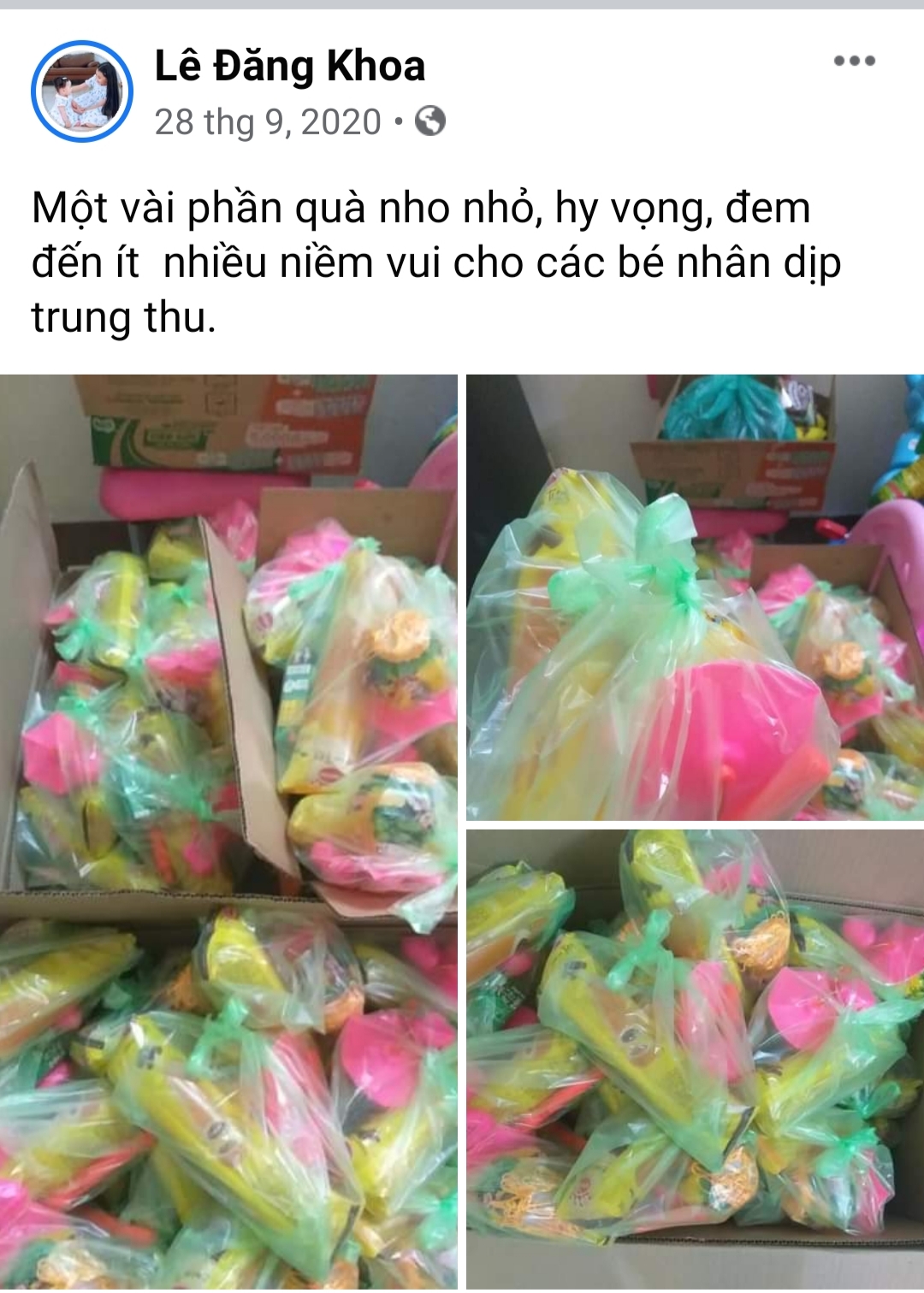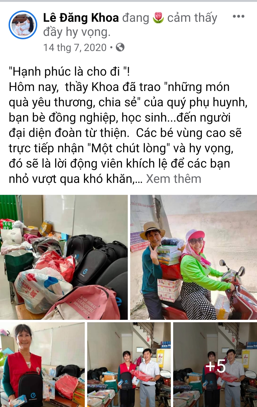 Thầy giáo Lê Đăng Khoa chia sẻ: "Xuất phát từ tình thương giữa con người với con người, tôi thấy cuộc sống xung quanh rất nhiều những mảnh đời bất hạnh, cần được sự sẻ chia của cộng đồng. Với sự cố gắng của bản thân và sự giúp đỡ nhiệt tình của các nhà hảo tâm đã giúp đỡ cho những hoàn cảnh khó khăn.