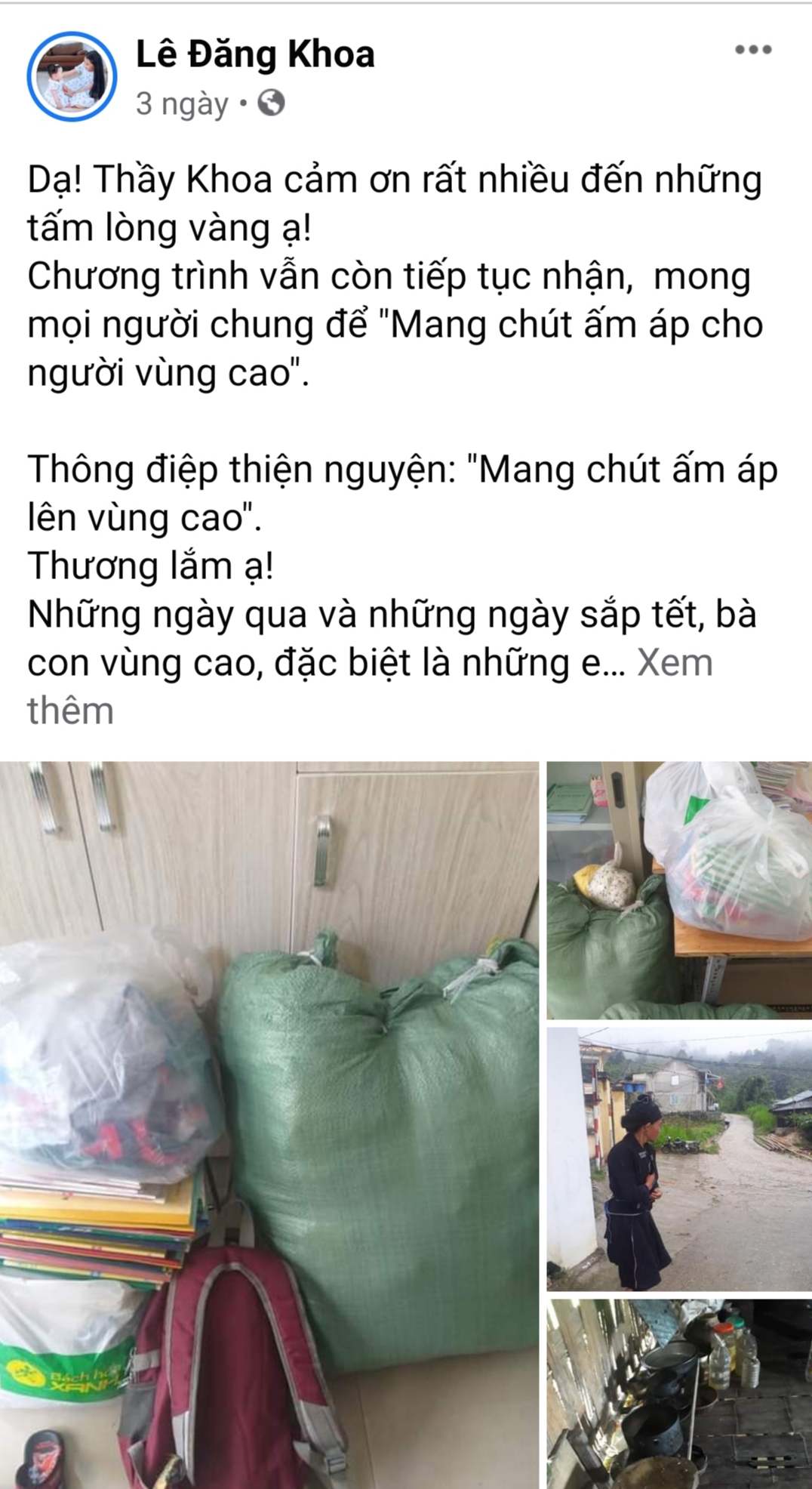 Hiện tại thầy Lê Đăng Khoa tiếp tục vận động quyên góp cho đồng bào vùng cao trong những ngày sắp Tết với chủ đề "Mang chút ấm áp lên vùng cao"