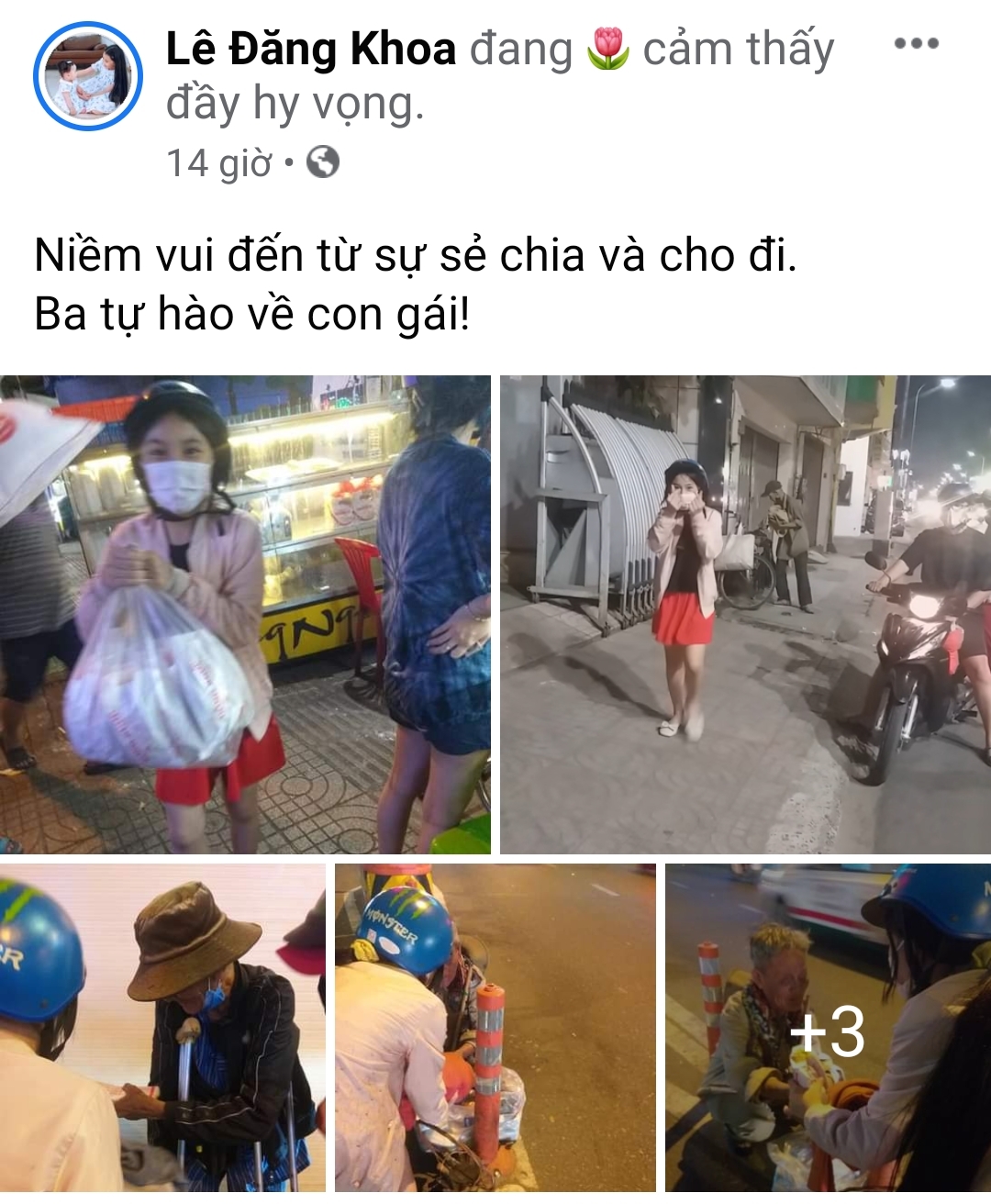 Con gái của thầy Lê Đăng Khoa đã biết chia sẻ, cùng Bố đi phát quà cho những người già neo đơn, vô gia cư mỗi tuần vào ngày nghỉ, một hành động nhân văn đáng được khích lệ và chia sẻ.