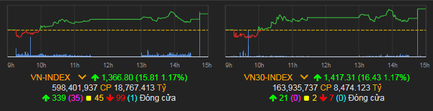 VN-Index tăng 15,81 điểm (1,17%) lên 1.366,8 điểm.