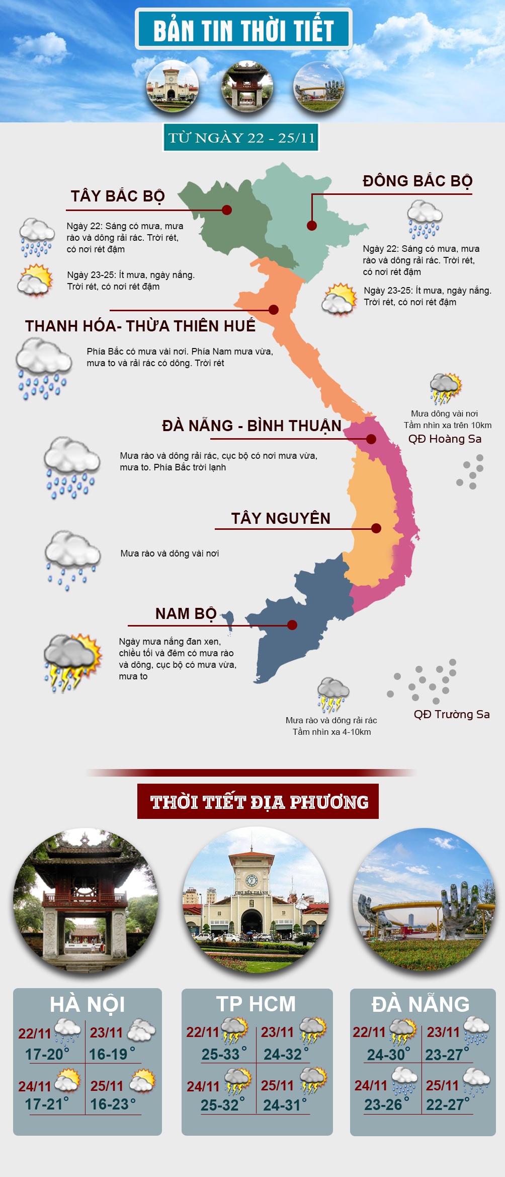 Từ ngày 22/11, khu vực từ Thanh Hóa đến Thừa Thiên Huế trời chuyển rét với nhiệt độ thấp nhất 15-18 độ C.