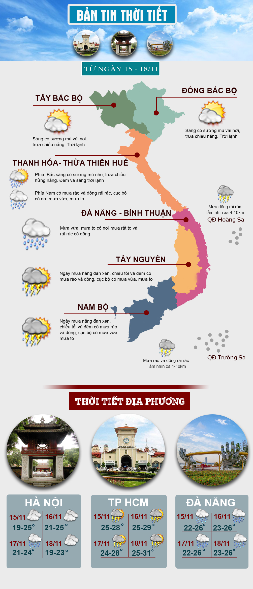 Tại miền Trung, khu vực phía Bắc Trung Bộ thời tiết tương đồng với Bắc Bộ. Từ Trung Trung Bộ trở vào, do ảnh hưởng của không khí lạnh kết hợp với nhiễu động gió Đông trên cao nên từ nay (15/11) đến ngày 18/11 có mưa vừa, mưa to, có nơi mưa rất to.