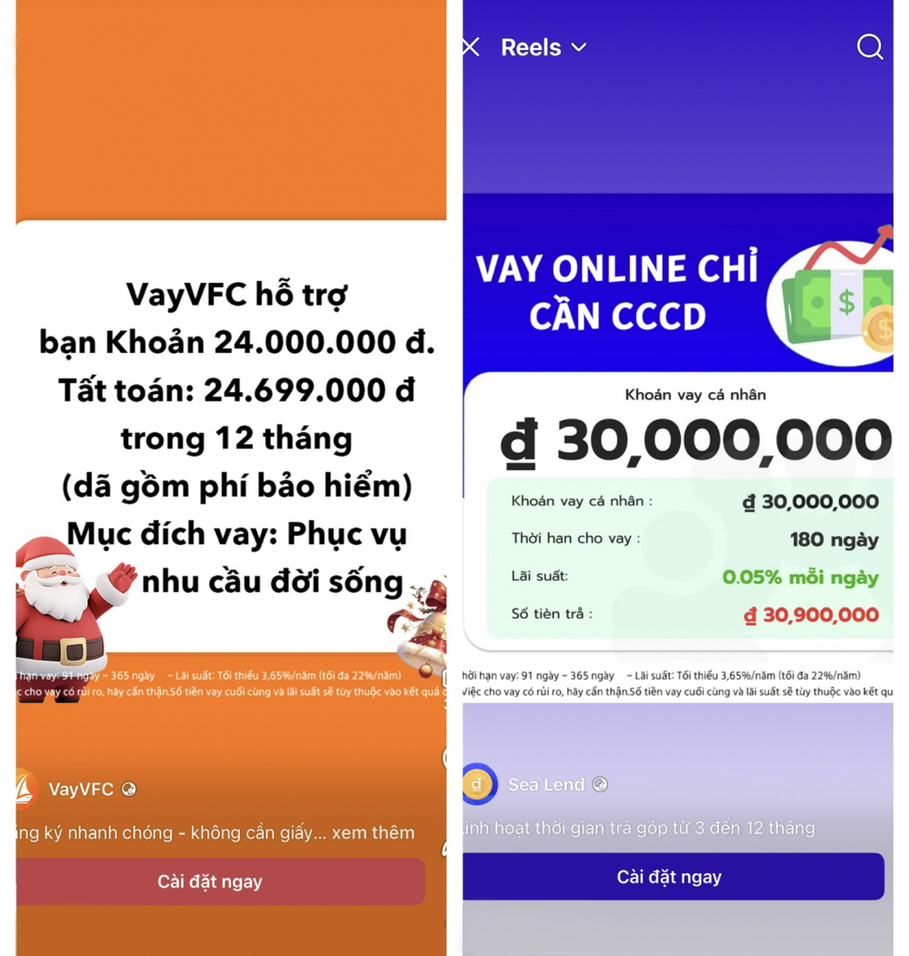 Tương tự, ứng dụng Hataco Vay cũng tung đoạn video quảng cáo lên Facebook Reels với những con số “đẹp”: nếu vay 20 triệu đồng trong thời hạn 12 tháng, mỗi tháng chỉ cần trả hơn 1,9 triệu đồng, tổng gốc và lãi sau 12 tháng chỉ 23,65 triệu đồng; nếu vay 10 triệu đồng trong 6 tháng thì tổng gốc và lãi phải trả chỉ 10,8 triệu đồng. Ứng dụng VayVFC quảng cáo mức lãi suất tối thiểu chỉ 3,65%/năm, tối đa chỉ 22%/năm, nếu vay 24 triệu đồng trong vòng 12 tháng thì tổng tiền gốc và lãi chỉ 24,7 triệu đồng.